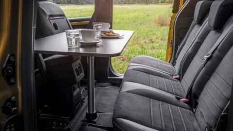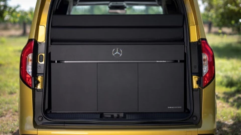 El mueble de cocina opcional es el otro elemento clave que forma parte del módulo Marco Polo para la nueva Clase T. El sistema incluye cajones con mecanismo push-to-open y soft-close, un fregadero con depósito de agua de 12 litros y un cajón frigorífico de 15 litros, así como una cocina de gas que se puede quitar fácilmente cuando sea necesario y más cajones para cubertería y almacenaje de alimentos. También hay dos sillas de camping y una mesa a bordo que está disponible con dos pies para instalarla tanto dentro, detrás de la consola central, como fuera de la Clase T, una novedad en este segmento.