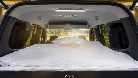 En el módulo Marco Polo se incluye una unidad de cama para dos personas, con un área para dormir de 2 metros de largo por 1,15 metros de ancho. La cama incluye un colchón de 10 centímetros de grosor que garantiza el descanso con una posición ergonómica. El marco de la cama se puede sacar cómodamente, desplegando el colchón, mientras que esta estructura queda plegada en el maletero cuando no está en uso.