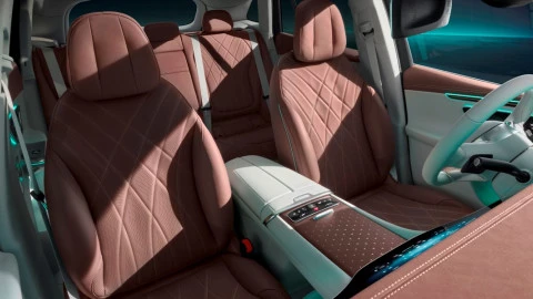 Los ventiladores exteriores tienen un diseño de turbina y forma parte del sistema de iluminación de ambiente que armoniza la estancia interior del EQE SUV. La banda de ventilación de la cabina continúa visualmente en las puertas delanteras, mientras que la sección delantera de la consola central se une al panel de instrumentos. Los módulos independientes de las puertas integran los controles para la regulación eléctrica de los asientos, así como los tiradores que permiten abrir las puertas.