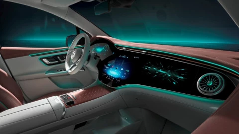 El MBUX Hyperscreen disponible opcionalmente en el interior del Mercedes EQE SUV implementará los últimos avances en digitalización. Todo el frontal del salpicadero se convierte así en una gran pantalla panorámica de 1,41 metros de ancho compuesta por tres monitores independientes: un cuadro de instrumentos de 12,3”, una pantalla multimedia de 17,7” y una pantalla para el copiloto de 12,3”, todo ello fusionado en un solo panel de vidrio que brinda información y entretenimiento al conductor y al acompañante delantero.