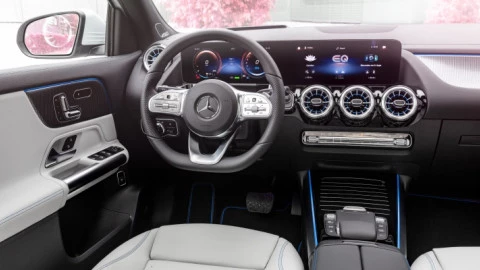 En el interior del nuevo Mercedes EQA, el sistema de infotainment MBUX con doble pantalla widescreen de 10,25 pulgadas, los detalles en azul y oro rosa o su amplio maletero de 340 litros son los elementos básicos. La personalización es un apartado importante en el nuevo miembro de la familia EQ. Por ello, el interior está disponible con seis combinaciones de símil cuero ARTICO y dos opciones de cuero para la tapicería. Estos acabados de lujo se pueden acompañar de cuatro tipos de molduras para el salpicadero y la consola central, y dos diseños de volante específicos.