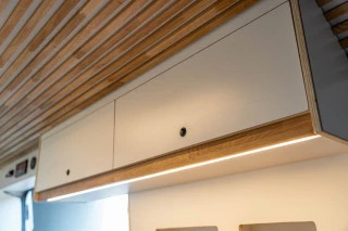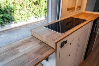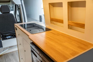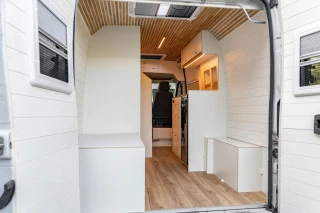 Furgoneta camperizada L3H2 de diseño nórdico utilizando materiales de madera HPL premium y roble para el acabado. Pueden viajar cómodamente 4 pasajeros y tiene 4 plazas para dormir. Asientos equipados con cinturón de seguridad e isofix. Furgoneta camperizada de manera artesanal en nuestro taller, cuidando cada detalle. Pregúntenos para mayor información a través del formulario de contacto.
