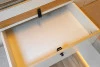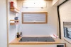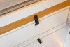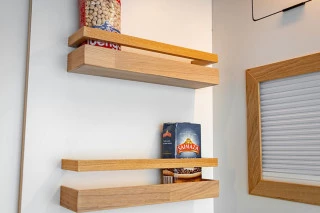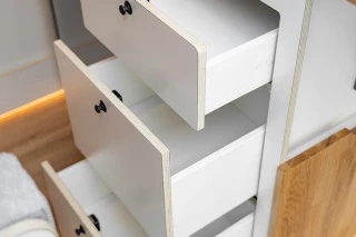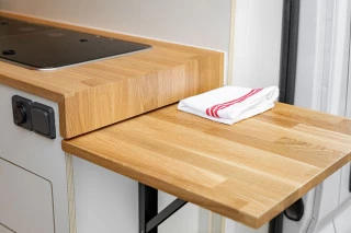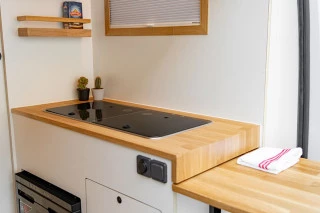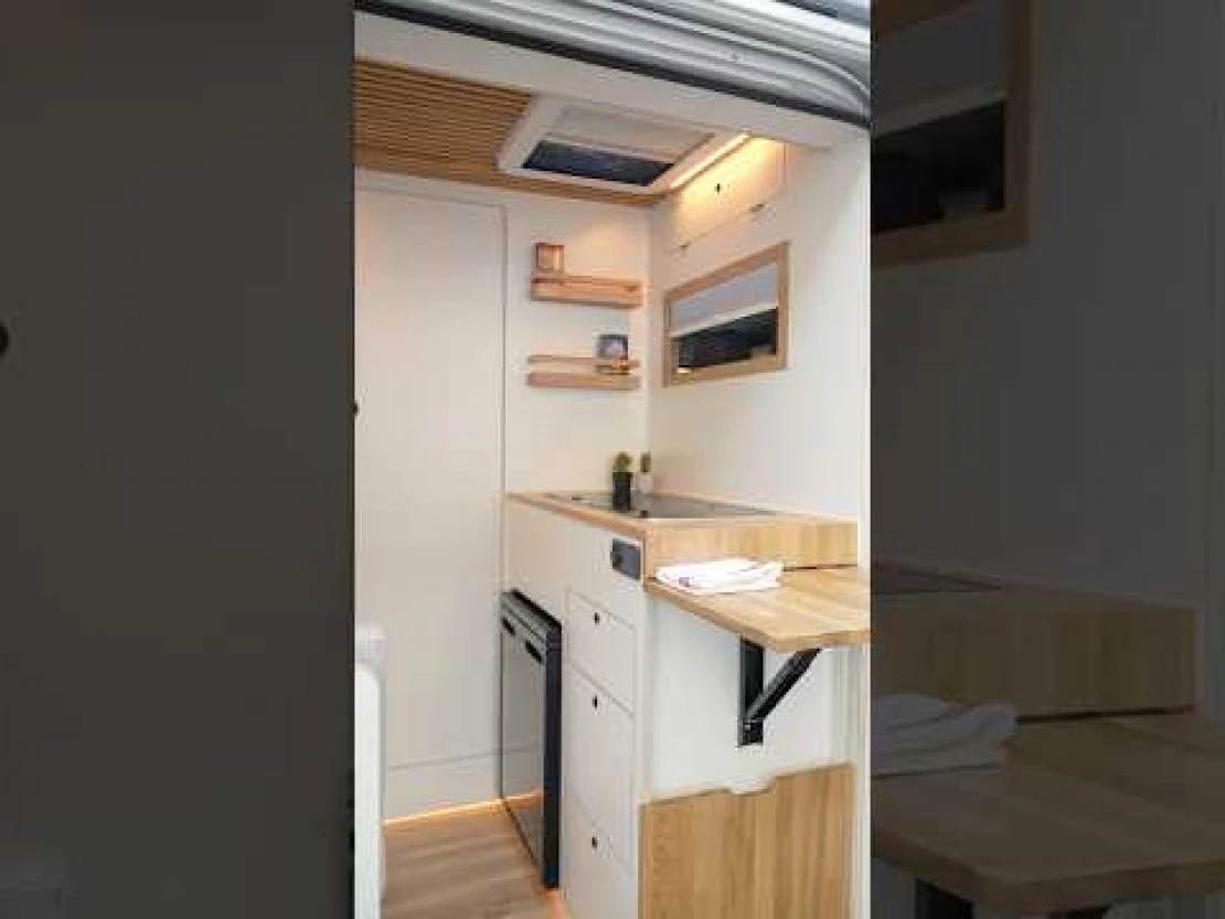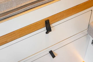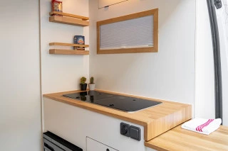 El mobiliario está realizado a medida y trabajado de forma artesanal, utilizando panelado de contrachapado de chopo con acabado en HPL blanco mate y madera de roble. El panelado interior está acabado en pico de gorrión horizontal, consiguiendo simular a las duelas de la madera, y el acabado en lacado blanco mate le aporta rigidez y durabilidad. Un material que hace de nuestras furgonetas camperizadas, modelos muy personalizados y singulares. El suelo está equipado con parquet vinílico antihumedad en imitación a la madera AC5 colocado sobre aislante térmico.