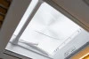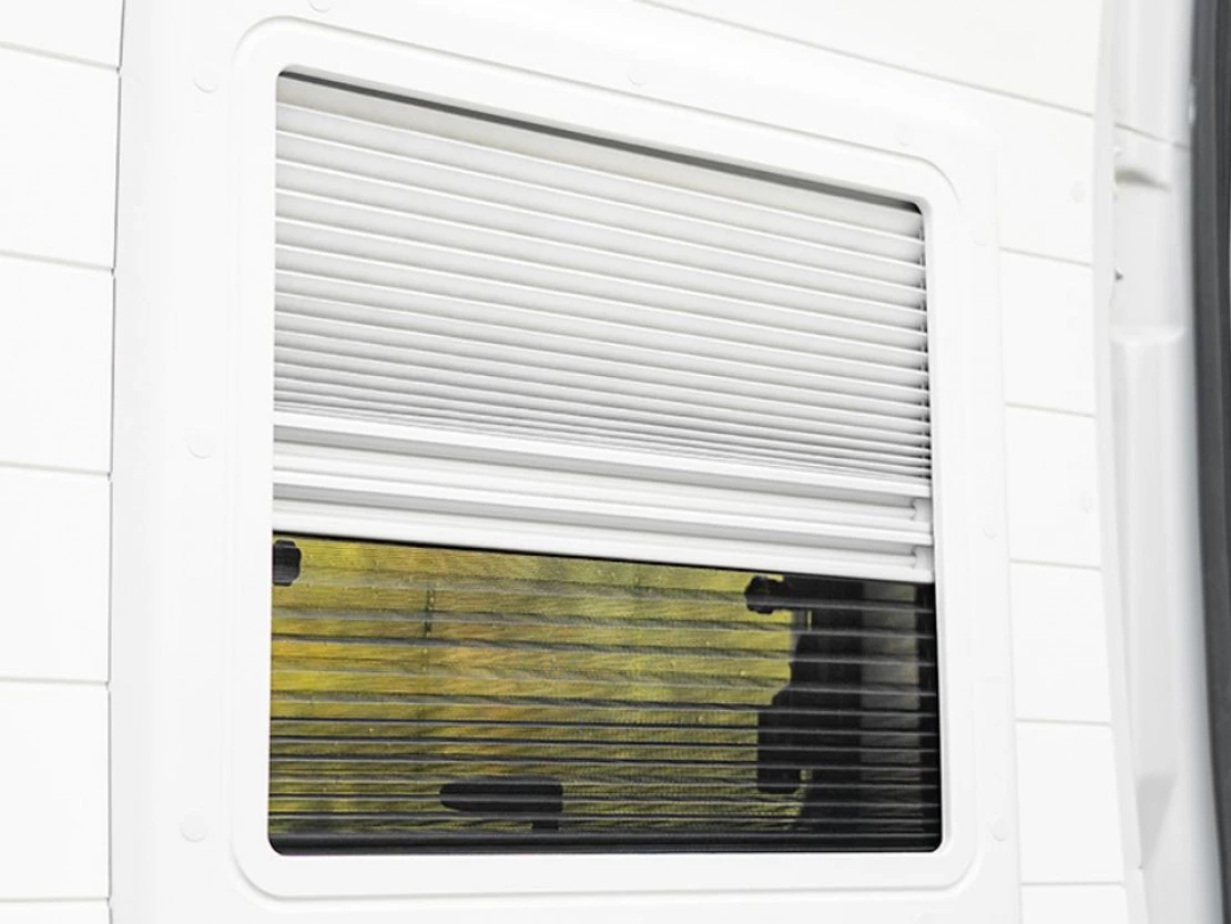 Todas las ventanas y claraboyas están equipadas con oscurecedor y mosquitera, así como cierre de seguridad, para que puedas descansar cómodamente con apertura abatible y personalizable. Cuenta con un total de 3 claraboyas, ubicada en la zona delantera (cocina), en la zona trasera (dormitorio) y en el baño interior, y 3 ventanas abatibles, ubicadas en ambas puertas del maletero y en el lateral de la puerta corredera.