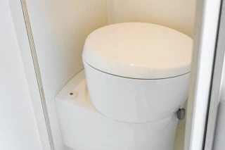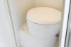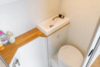 El baño interior está muy enfocado en ofrecer la máxima comodidad. Está equipado con ducha de agua caliente y fría, lavabo y potti químico fijo cuyo depósito de aguas negras es accesible desde el exterior de la camper para su vaciado. Para separar las zonas de ducha y aseo, incluimos una cortina antihumedad. A nivel almacenamiento, cuenta con un altillo con bastante profundidad equipado con cierre de seguridad y freno, así como percheros para las toallas. Todo su interior cuenta con tratamiento antihumedad.
