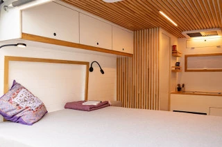 La zona dormitorio está compuesta por una cama fija doble de 190cm (largo) x 125cm (ancho) y una cama individual interbanco de 178cm (largo) x 60cm (ancho mínimo), equipados con colchón viscoelástico para un mayor confort. A nivel iluminación, cuenta con 2 lamparitas de luces LED de intensidad regulable que incluyen puntos de carga USB. En el techo localizamos una claraboya abatible con diferentes modalidades de apertura y en ambas puertas traseras, ventanas abatibles equipadas con oscurecedor y mosquitera para aportar luz natural y ventilación. Para aprovechar el ancho máximo de la furgoneta, se ha ajustado el panelado y aislamiento al espacio interior de la chapa.