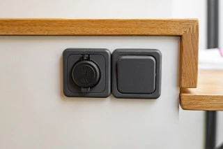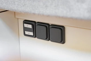 El control de la camper van se realiza a través de una centralita CBE PC210 muy completa e intuitiva que indica del nivel de batería, carga de la placa solar y el nivel del depósito de aguas limpias y grises, así como la temperatura exterior e interior, entre otros. El equipamiento eléctrico incluye: batería AGM de 250 AH, cargador de batería CBE de 16AMP, inversor onda pura de 300W, además de diferentes puntos de corriente a 220V y USB distribuidos por el interior de la furgoneta. Existe una toma exterior de 230V para poder cargar la furgoneta con cable (incluido).